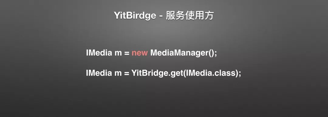 接下来我们来看具体到代码上是如何使用的:首先是作为服务使用方,也就是上一张图右半部分的Client。我们看到上面是传统的做法,首先声明一个借口类型,然后new出接口的实现类给他赋值。 而使用了YitBridge的时候,你是不需要关心接口的实现类到底是谁的。这就是YitBridge唯一的用处,隐藏实现类,做到彻底的面相接口编程。