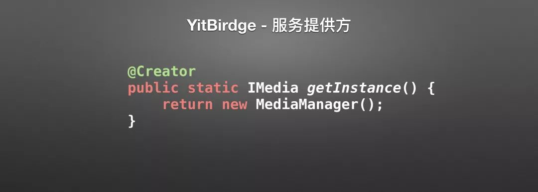 之前说过,YitBridge将模块之间依赖倒置,由之前的服务提供方被动的接受调用方调用变为,服务方主动提供服务给调用方。那作为服务提供方需要做些什么事呢,非常简单,你只需要给你的对象提供方法加上一个@Creator注解,告诉YitBridge这是一个创建器方法就可以了。