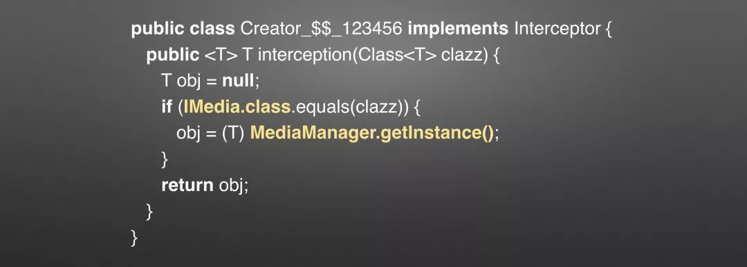 这是 YitBridge 在编译以后生成的一段类:还是继续我们前面讲的那段示例来继续,在运行时,他会根据你传入的 get() 方法的参数,来判断你所需要的是哪个接口的实现,然后去调用对应的创建器方法。