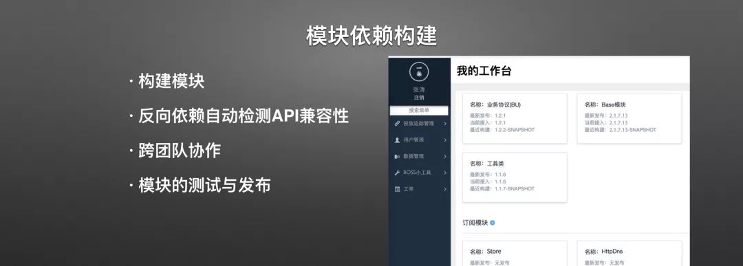 这里是我们目前使用的模块依赖构建工具,大家可以从这张图中感受一下。 构建工具,主要的功能是很明显的,就是用于构建模块,在这之上,还有隐含的功能,就是集中了构建模块的权限,可以更便于统一管理; 当然还有最重要的优势就在于模块版本的管理,你可以很清晰的知道当前主应用所接入的模块的版本是哪个,当前最新构建的SNAPSHOT是哪个,以及每个版本的更新日志; 这样做了以后,在跨团队协作上的沟通就大大降低了,如果你已经接入或者即将接入的模块是另一个团队开发的模块组件,那你可以直接关注它,它的所有版本变动日志,最新版本全都一目了然; 并且可以通过平台简化模块的测试与模块发布的流程,比如提测的时候,如果是一次兼容版本的发布,你只需要告诉测试提测分支,测试可以自己根据现在线上应用的tag,同时引入当前提测的模块替换老版本的模块重新编译,很容易就能控制变量。