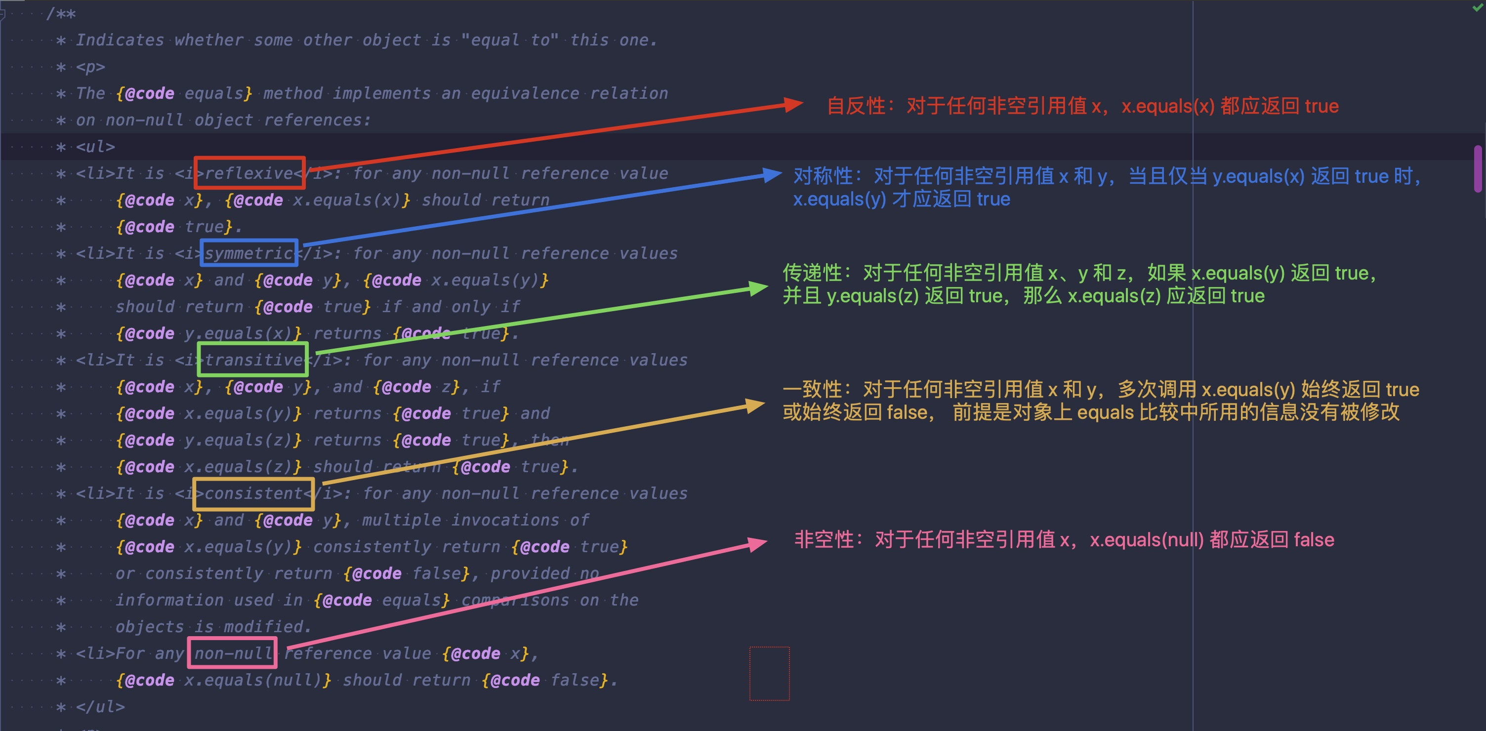 关于重写 equals 方法的约束,同样在该方法的注释中写的很清楚了,我在这里再说明一下: