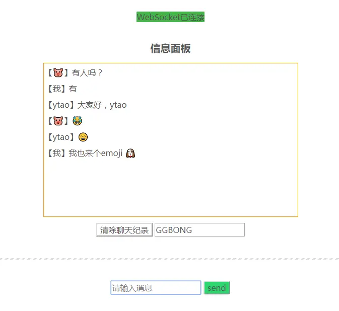 启动服务端后,先实验我们"价值一个亿的AI",只有一个连接用户时,发送信息结果如图: