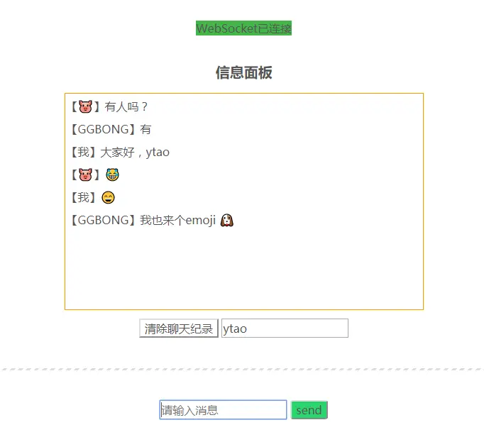 我们在处理中设计的业务逻辑有,如果只有一个连接来发送信息聊天,那么我们就以服务器自动回复,如果存在一个以上,我们就将信息发送给其他人。