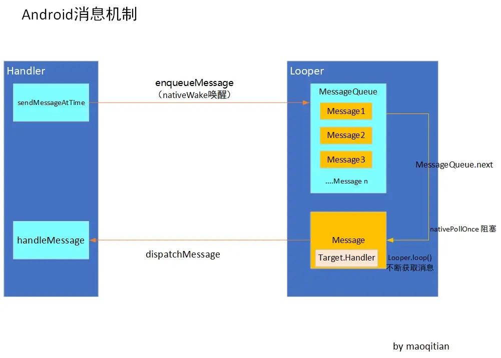 - 通过对nextPollTimeoutMillis的了解,next方法是如何等待呢?换个词可能更准确,应该叫阻塞,这里注意到next方法循环中的nativePollOnce(ptr, nextPollTimeoutMillis)方法,它的实现在native层,可以实现阻塞的功能,具体原理是使用epoll,它是一种linux的I/O事件通知机制,I/O输入输出对象使用的是管道(pipe),具体native层分析请看Gityuan大佬的分析文章Android消息机制2-Handler(Native层)