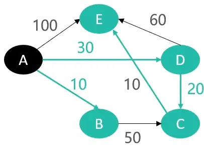 - 对D→E进行松弛操作,就能计算出A→E之间的最短路径,为0