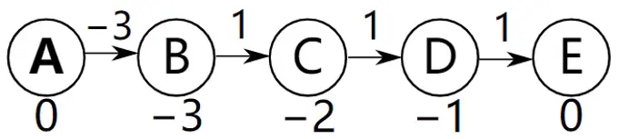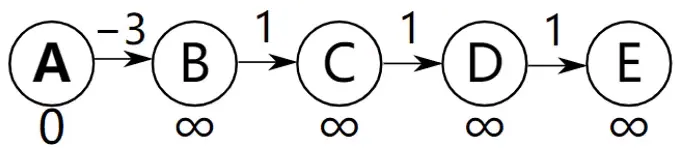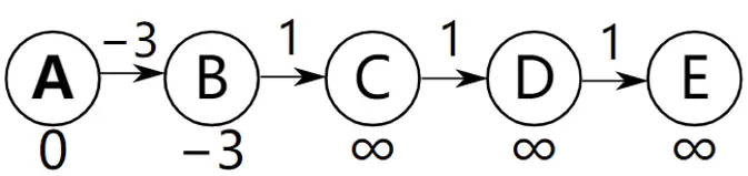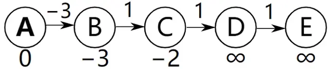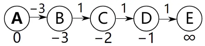 同样是下图进行松弛操作,但是这一次的顺序却和前面不一样,前面是从左到右进行松弛操作,这一次是从右到左进行松弛,即松弛的顺序为DE,CD,BC,AB,情况就不一样了