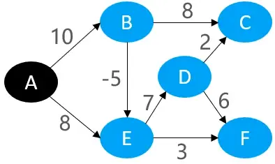 根据上图,一共有8条边,Bellman-Ford的原理,是对这8条边都进行松弛操作,而且没一条边都进行V - 1次松弛操作,现假设每次松弛操作的顺序都是:DC,DF,BC,ED,EF,BE,AE,AB