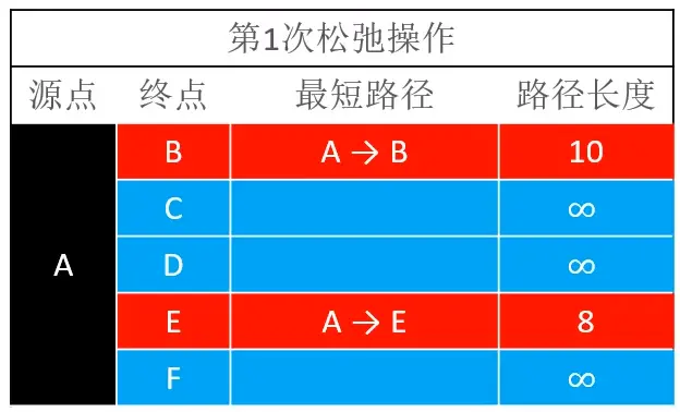 结合前面对每一轮松弛操作的结果,可以知道这一轮松弛操作,DC,DF,BC,ED,EF,BE都是没有结果的,只有对AE,AB才会有结果,所以第一轮松弛操作的结果如下