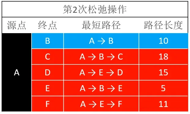 第二轮松弛操作,DC,DF松弛操作会失败,BC,ED,EF会松弛操作成功,并且由于E多了一种新的选择A→B→E,从A到达E,并且发现新的路径路径长度更短,所以对会更新A到E之间的路径长度,原来的A→E这条边松弛操作,由于路径长度大于现在更新的长度,所以会松弛失败。最终第二轮松弛操作的结果如下所示
