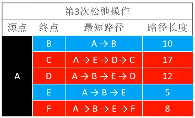 由于前面一轮的松弛操作,顶点D已经有最短路径,所以在这一轮松弛操作中,对DC,DF进行松弛操作可以成功。由于DC的松弛操作成功,最终会更新AC之间的最短路径为A→B→E→D→C,路径长度为17,对DF进行松弛操作时,得到的结果是21,大于原来的路径长度,所以会松弛失败。另外,还会更新的路径有AD,最短路径为A→B→E→D,AF,最短路径为A→B→E→F。BC之间的松弛操作会失败。最终这一轮松弛操作完成后的结果如下