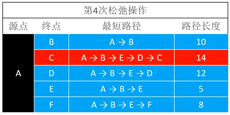 第四轮松弛操作,计算出了顶点E到源点的最短路径,完成以后得到的结果如下