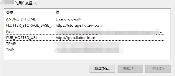 变量名PUB_HOSTED_URL,变量值https://pub.flutter-io.cn