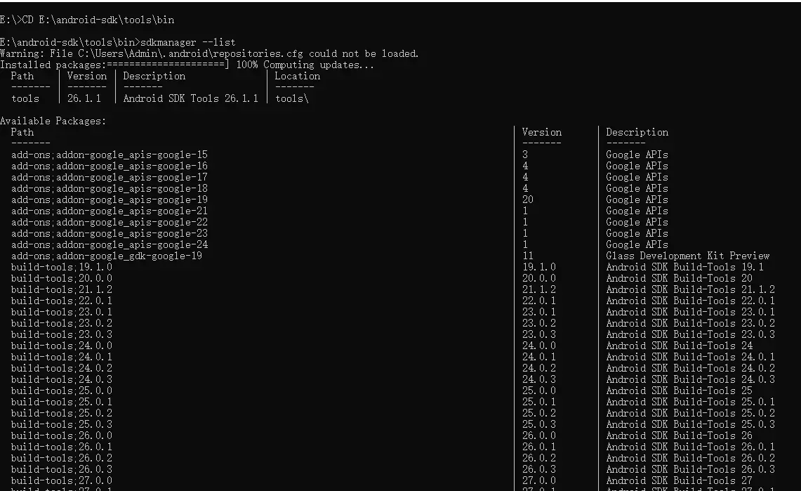 进入cmd,cd到android sDK tools bin 下 执行sdkmanager --list查看packages,可以查看版本