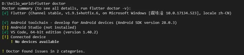 - 在终端中运行flutter doctor,查看输出是否有问题