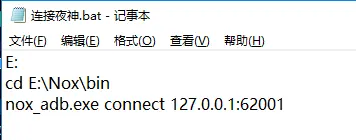 - 打开你安装好的夜神模拟器,夜神运行起来后在cmd里面重连,比如:D:\Nox\bin\nox_adb.exe connect 127.0.0.1:62001,这里可以新建个bat文件,不用每次都要输入,点击bat文件就行