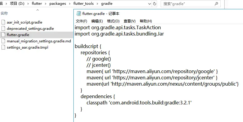 在你flutter sdk 的 如下路径 下的 flutter.gradle 也同样添加镜像。 flutter\packages\flutter_tools\gradle\flutter.gradle 下的buildscript{repositoreis{注释掉google() jcenter()}}