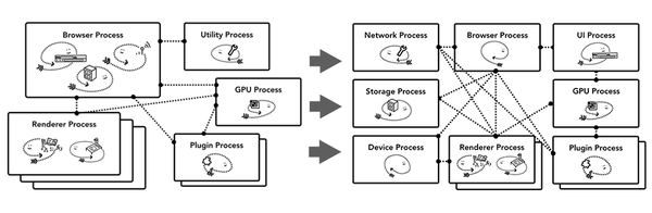 - 沙箱运行:渲染器在单独的进程中运行,通过沙箱限制其对系统资源(文件、网络、显示、击键)的访问,而须通过父浏览器进程访问