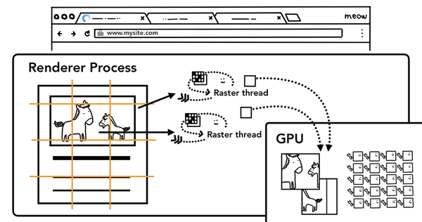 2) 栅格化:合成器线程然后栅格化每个层。一个图层可能像页面的整个长度一样大,因此合成器线程将它们分成多个图块并将图块发送到栅格线程。