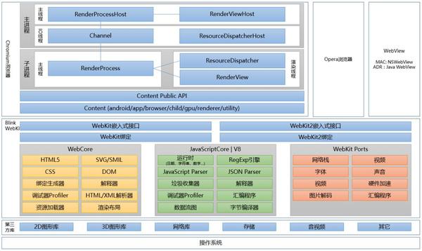 - 第三方库:这些库是WebKit运行的基础,包括2D图形库、3D图形库、网络库、存储库、音视频库等;