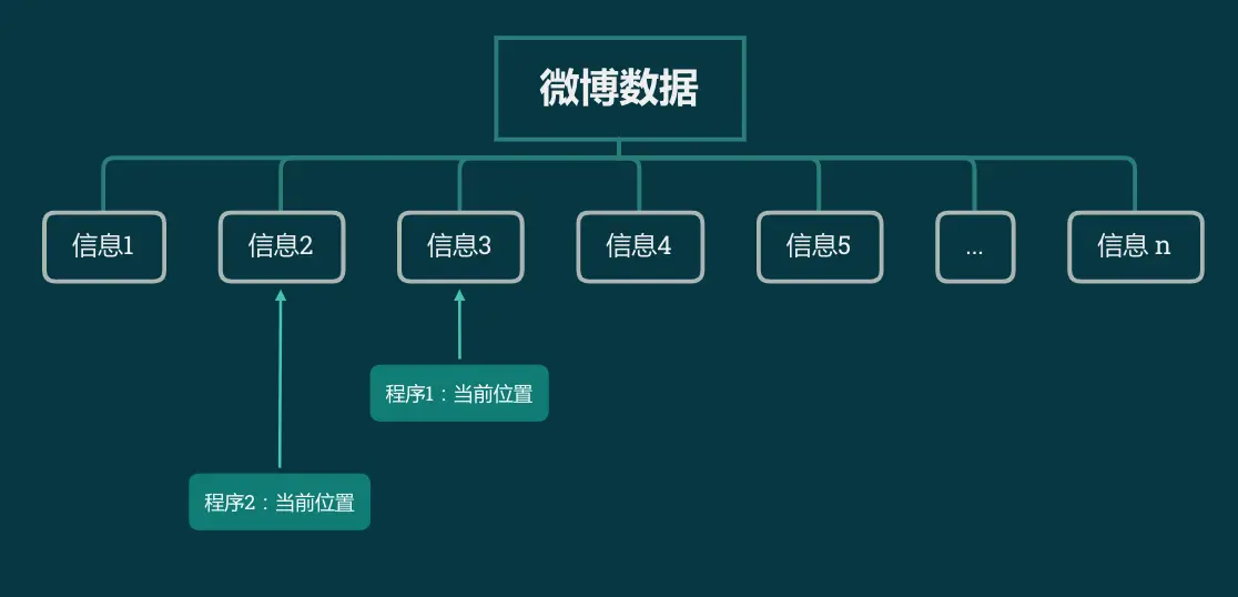 但我如果有两个程序呢?程序1读取每一条数据,再转存到数据库。程序2读取每一条数据,再检查是否有关键词。这种情况下,信息1应该能被程序1消费,也能被程序2消费。但上面这种方案显然是不行的。当程序1消费了信息1,程序2就再也拿不到它了。