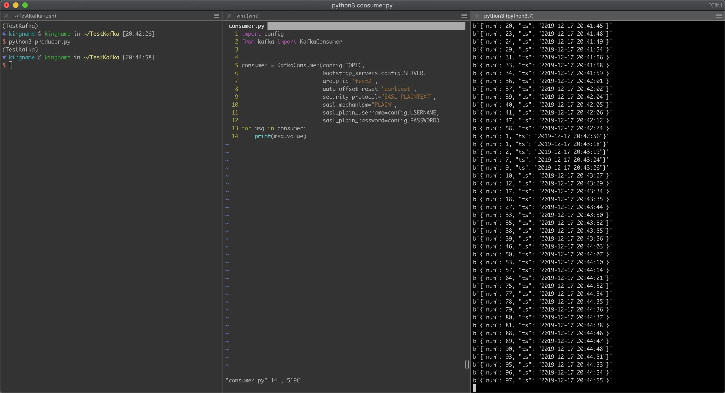 本文演示所用的Kafka由我司平台组的同事搭建,需要账号密码才能连接,所以我在配置文件中加上了USERNAME和PASSWORD两项。你使用的Kafka如果没有账号和密码,那么你只需要SERVER和TOPIC即可。
