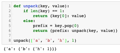 现在,写一个函数unpack,这个函数的作用是传入两个参数['a', 'b', 'h']和1输出{'a': {'b': {'h': 1}}}: