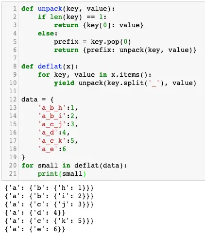 接下来,我们实现第二个函数deflat,它把目标字典分成key, value对,并把 key 转换为列表以后传给unpack函数: