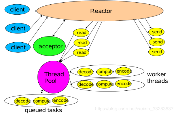 Reactor模式是事件驱动的,有一个或多个并发输入源,有一个Service Handler,有多个Request Handlers;这个Service Handler会同步的将输入的请求多路复用的分发给相应的Request Handler。