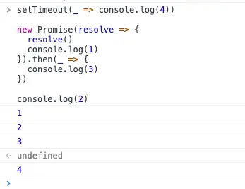 setTimeout就是作为宏任务来存在的,而Promise.then则是具有代表性的微任务,上述代码的执行顺序就是按照序号来输出的。