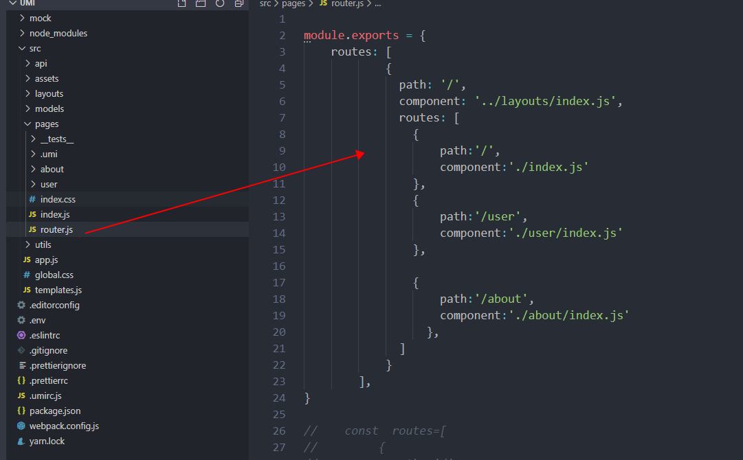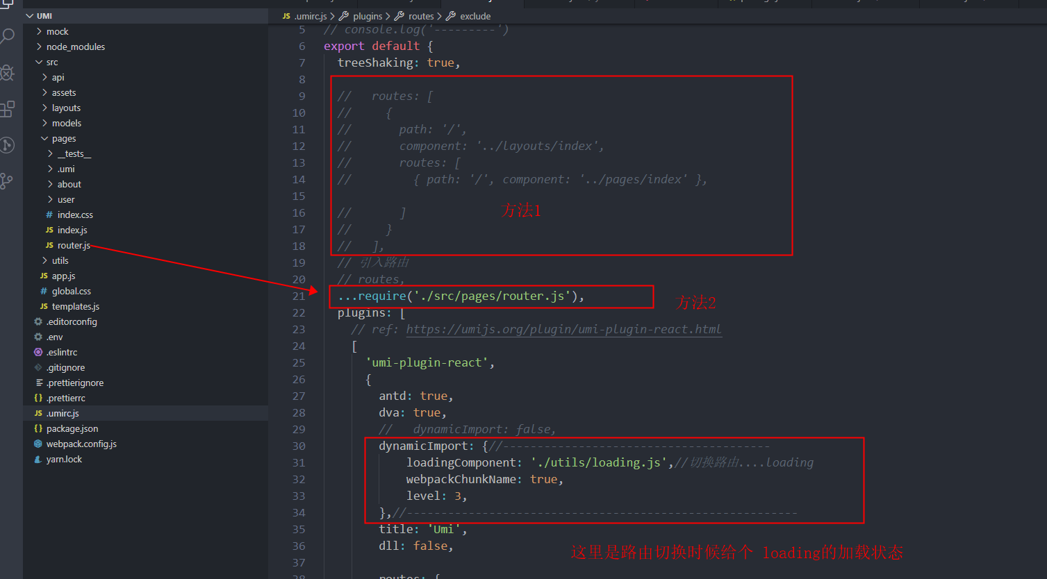 2.自定义式路由在 umirc.js中routes里面配置相应的路由,也可以在pages里面新建一个router.js文件去配置