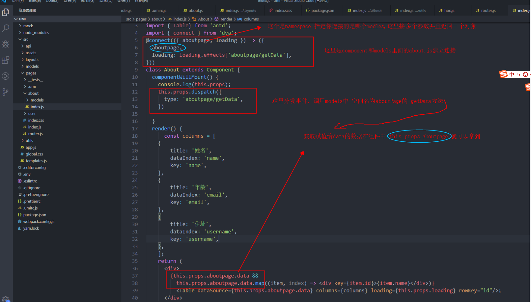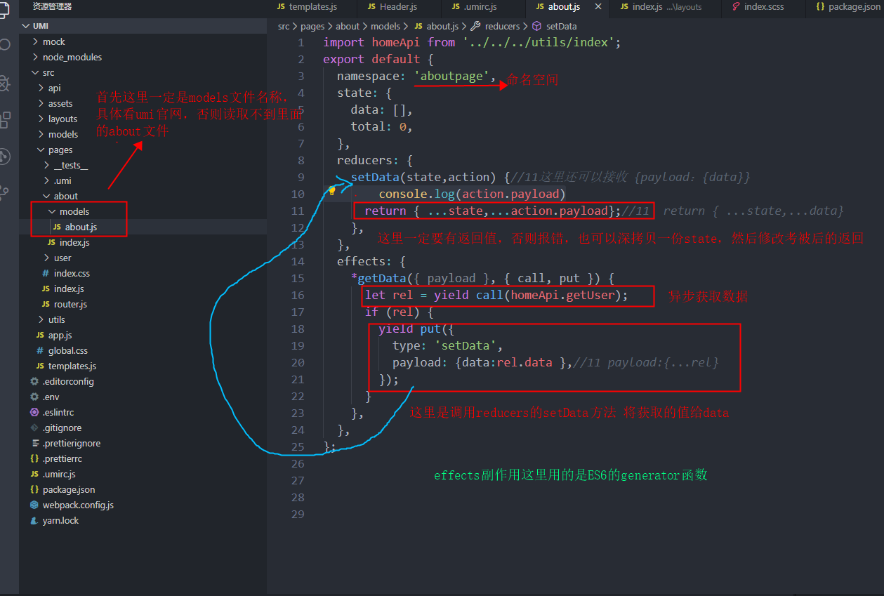 3.对于dva 中models这块的理解这里以pages下的about为列,具体还是要看dva官网https://dvajs.com/guide/introduce-class.html#app-model