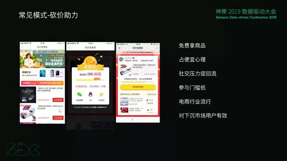 砍价助力模式的关键是用户的占便宜心理,并伴有及时反馈,如上图的分享界面,让用户感觉只差一点就可以达到目标,且针对新用户其激励力度更大,如 iphone 等礼品的巨大折扣等,因此很容易泛滥,或造成社交压力,目前这种方式对下沉市场用户较为有效。