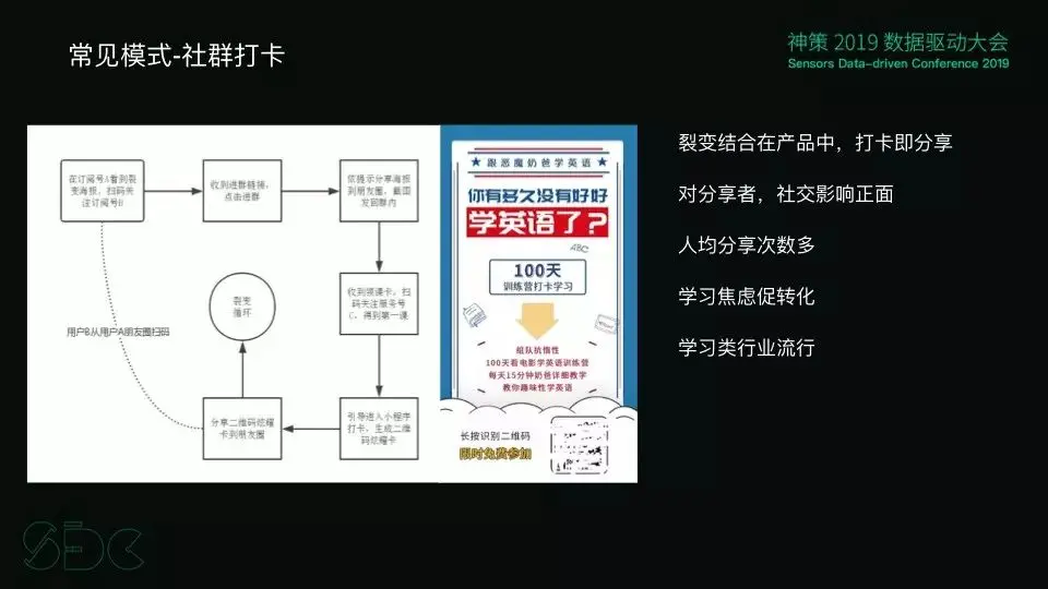 社群打卡模式的特点是将裂变巧妙地结合在产品中,具有诸多正向循环的好处,如薄荷阅读的英文阅读需打卡才能完成学习,其分享动作对分享者也是形成正面的社交影响,促使用户形成较高频率的分享,而非用户见到分享后的学习焦虑也容易促转化。