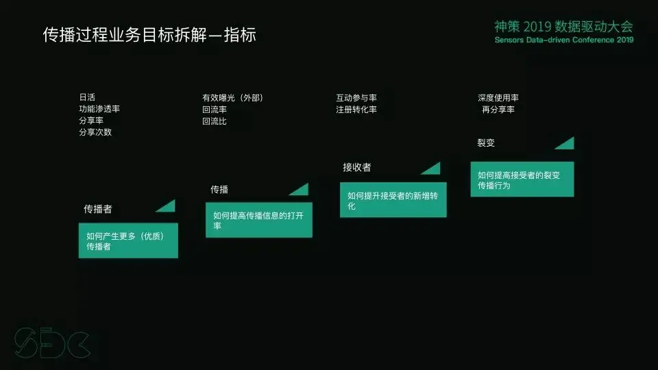 针对这四个环节,便将传播关键具象化,如传播者阶段关注争取更多优质传播者,在信息传播阶段提高传播信息流通和有效曝光,在接受者转化提升接受者的新增转化,在裂变阶段,提高接受者的裂变传播行为。且在不同阶段也具备相应的关键指标,如下图: