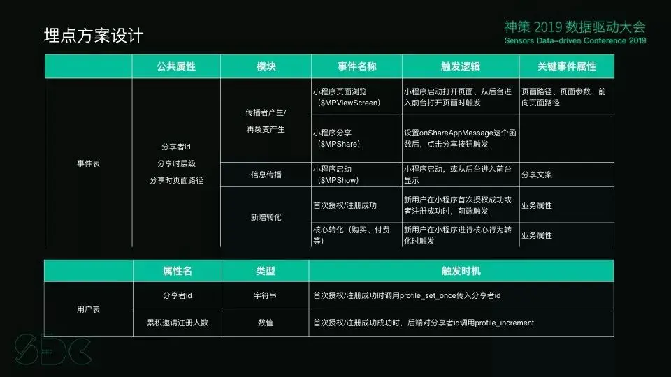 在神策数据的产品中,会有一些预置事件,如小程序页面浏览、小程序分享、小程序启动等,从事件的属性角度来说,企业需重点考虑如何记录用户的分享信息,包含将分享行为及分享用户特征等信息记录在事件表和用户表,基于这些信息,可辅助后续的深度分析。