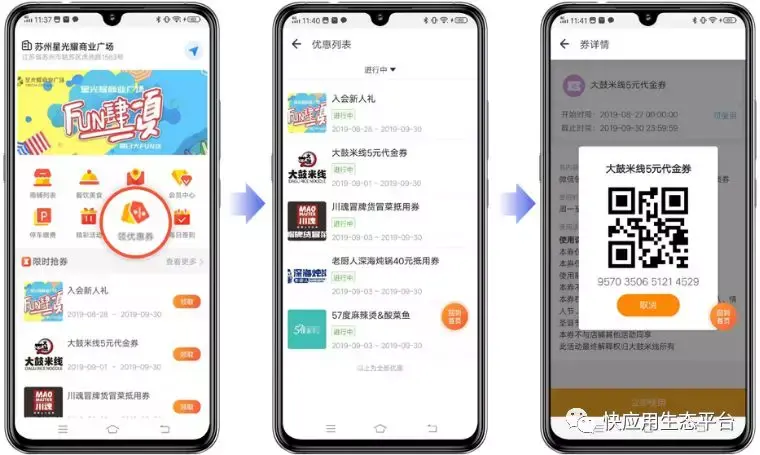 而且,快应用还支持会员注册、会员优惠以及领券、核销,完成从精准引流、拉新获客、会员转化、场景服务到会员复购的整个用户数字化运营闭环。