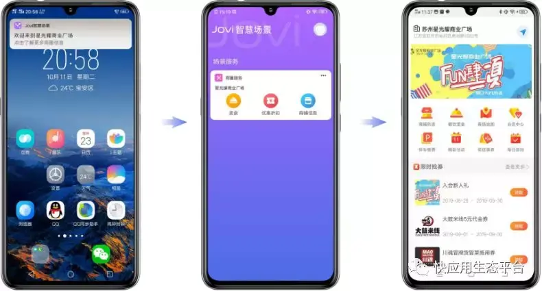 据该方案提供方“及刻热场”团队介绍,星光耀快应用入口丰富,除快捷搜索、快应用中心等秒开入口之外,联盟部分厂商还为快应用配置了负一屏场景卡片入口,例如已上线的vivo负一屏卡片。当用户进入星光耀广场时,负一屏场景卡片便会出现,点击直达快应用。用户无需关注、下载任何app,服务一触即达。