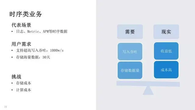 另一类我们称之为时序类业务挑战,包含日志、Metrics、APM 等场景。相比于搜索类业务重点关注高可用、高性能,时序类业务会更注重成本、性能。比如时序场景用户通常要求高写入吞吐,部分场景可达 1000w/sWPS;在这样写入吞吐下,保留 30 天的数据,通常可达到 PB 级的存储量。而现实是日志、监控等场景的收益相对较低,很可能用户用于线上实际业务的机器数量才是 100 台,而监控、日志等需要 50 台,这对多数用户来说,基本是不可接受的。所以在时序类业务中,主要的挑战在于存储成本、计算成本等方面。