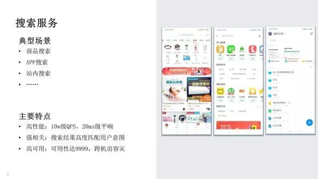 - 高可用:搜索场景通常要求 4 个 9 的可用性,支持单机房故障容灾。任何一个电商服务,如淘宝、京东、拼多多,只要故障一个小时就可以上头条。