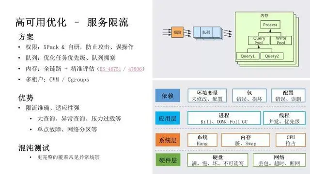 这里我们展开介绍下服务限流部分。我们做了 4 个层级的限流工作:权限层级,我们支持 XPack 和自研权限来防止攻击、误操作;队列层级,通过优化任务执行速度、重复、优先级等问题,解决用户常遇到的 Master 任务队列堆积、任务饿死等问题;内存层级,我们从 ES 6.x 开始,支持在 HTTP 入口、协调节点、数据节点等全链路上进行内存限流,同时使用 JVM 内存、梯度统计等方式精准控制;多租户层级,我们使用 CVM/Cgroups 方案保证多租户间的资源隔离。