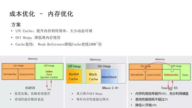 在内存优化方面,业界的方案是什么样的呢?ES 社区从 7.x 后支持索引放于堆外,和 DocValue 一样按需加载。但这种方式不好的地方在于索引和数据的重要性完全不同,一个大查询很容易导致索引被淘汰,后续查询性能倍数级的衰减。Hbase 通过缓存 Cache 缓存索引、数据块,提升热数据访问性能,并且从 HBase 2.0 开始,重点介绍其 Off Heap 技术,重点在于堆外内存的访问性能可接近堆内。我们基于社区经验进行迭代,在 ES 中引入 LFU Cache 以提高内存的利用效率,把 Cache 放置在堆外以降低堆内存压力,同时通过 Weak Reference、减少堆内外拷贝等技术降低损耗。最终效果是内存利用率提升 80%,可以充分利用大存储机型,查询性能损耗不超过 2%,GC 开销降低 30%。