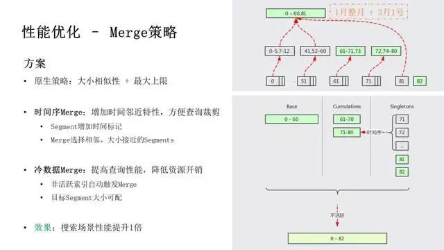 查询方面,我们通过优化 Merge 策略,提升查询性能,这部分稍后展开介绍。基于每个 Segment 记录的 min/max 索引,进行查询剪枝,提升查询性能 30%。通过 CBO 策略,避免查询 Cache 操作导致查询耗时 10+倍的毛刺,具体可参考Lucene-9002。此外,我们也在尝试通过一些新硬件来优化性能,比如说英特尔的 AEP、Optane、QAT 等。
