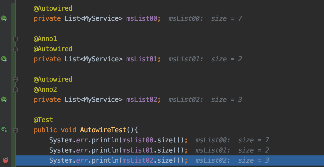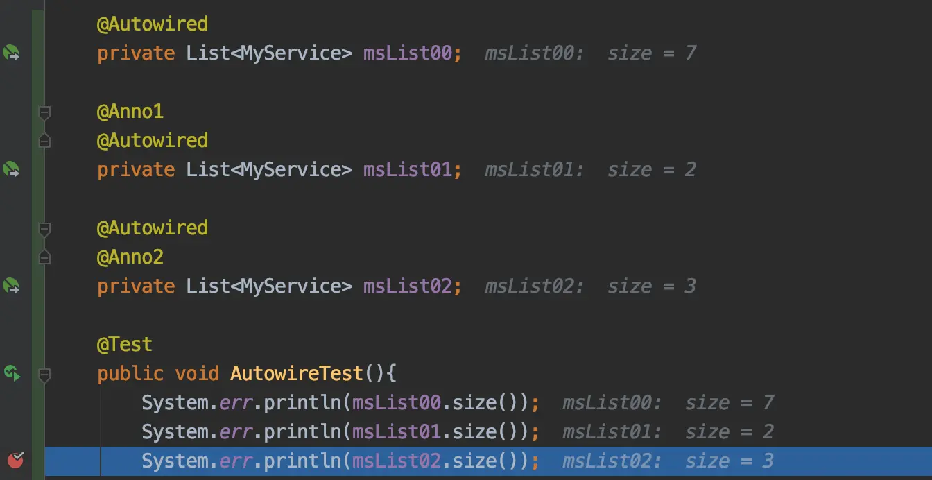 MyService实例@Autowired private List<MyService> instanceList00; @Anno1 @Autowired private List<MyService> instanceList01; @Autowired @Anno2 private List<MyService> instanceList02; @Test public void AutowireTest(){ System.err.println(instanceList00.size()); System.err.println(instanceList01.size()); System.err.println(instanceList02.size()); } - 效果: