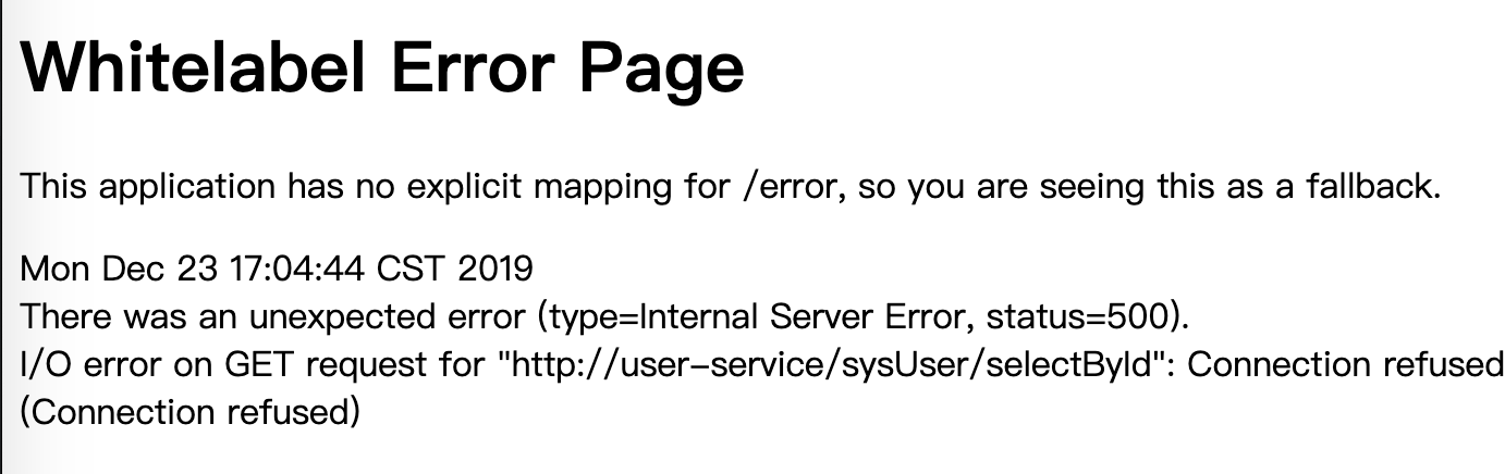 但是,此时如果我们调用了这些不正常的服务,调用就会失败,从而导致其它服务不能正常工作!这显然不是我们愿意看到的。如果现在user-service注册了8081、8082台实例,consumer-demo启动Ribbon负载均衡,此时我们停掉user-service的8082示例。eureka-server中针对user-service中还记录着8082实例,此时consumer-demo轮询到8082将报如下错误信息,但user-service的8081实例是可以提供服务的: