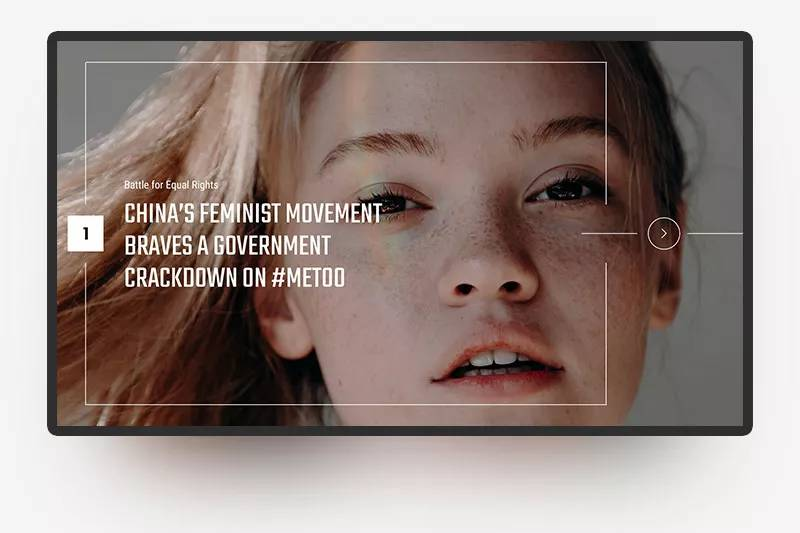 高清大图撑满全屏,加上展示性比较强的字体作为标题也是经典的搭配,但是在很多时候依然会让人觉得单调。线性元素的加入,不仅不会遮盖住作为视觉主体的图片,而且能够强化形式感,如果运用得当的话,还能作为视觉引导,强化交互,引导用户点击,非常有用。