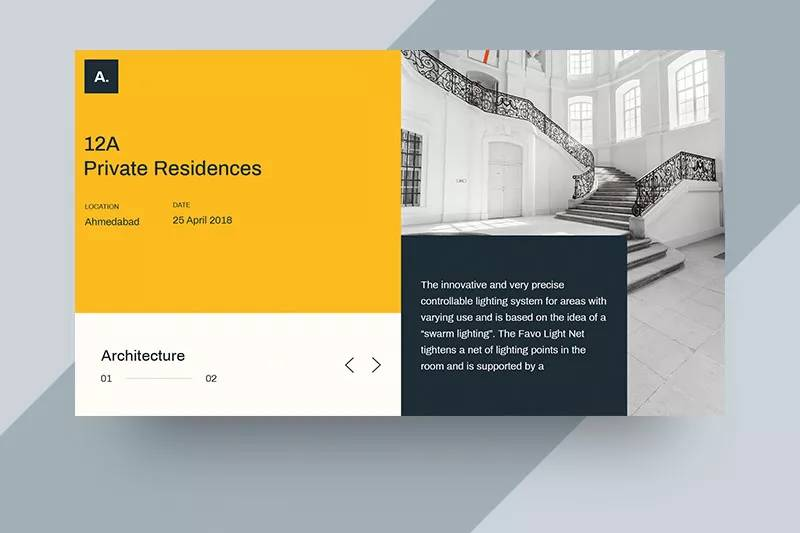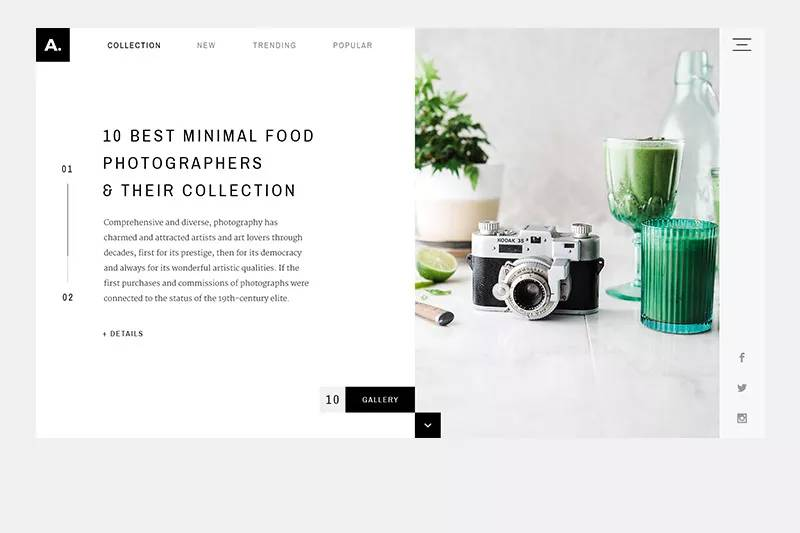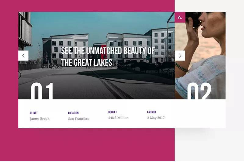 使用占据整个屏幕的高清大图固然赏心悦目,但是更多的图片在边界露个头,能够更好地吸引用户的好奇心,这比起单纯的左右翻页按钮更能够促进交互。这种不对称的布局,结合形式感极强的标题和数字元素,整体会显得更加优雅。