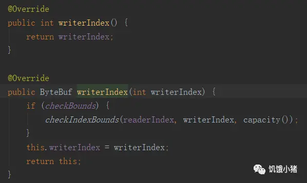 设置写的当前位置。可以使用writerIndex()和writerIndex(int)方法获取、设置writeIndex的值。每次调用writeXXX方法都会导致writeIndex向capacity移动,直到等于capacity为止。