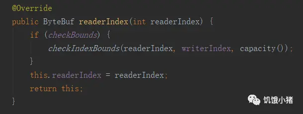 设置当前读的位置。可以使用readerIndex()和readerIndex(int)方法获取、设置readerIndex值。每次调用readXXX方法都会导致readerIndex向writerIndex移动,直到等于writerIndex为止。