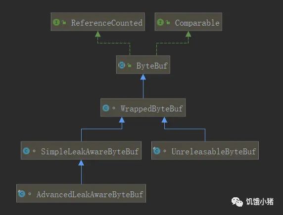 3、WrappedByteBuf:用于装饰ByteBuf对象,主要有AdvancedLeakAwareByteBuf、SimpleLeakAwareByteBuf和UnreleasableByteBuf三个子类。