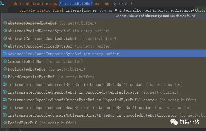 子类很多,我们上面说的三种缓冲策略的类实现都是最终继承实现AbstracByteBuf,而AbstractByteBuf本身并没有具体去对不同ByteBuf缓冲区去做具体实现,而是由子类去实现,原因很简单父类不知道子类去实现堆内存还是直接内存,还是复合缓冲区;只是提供一个抽象接口而已;